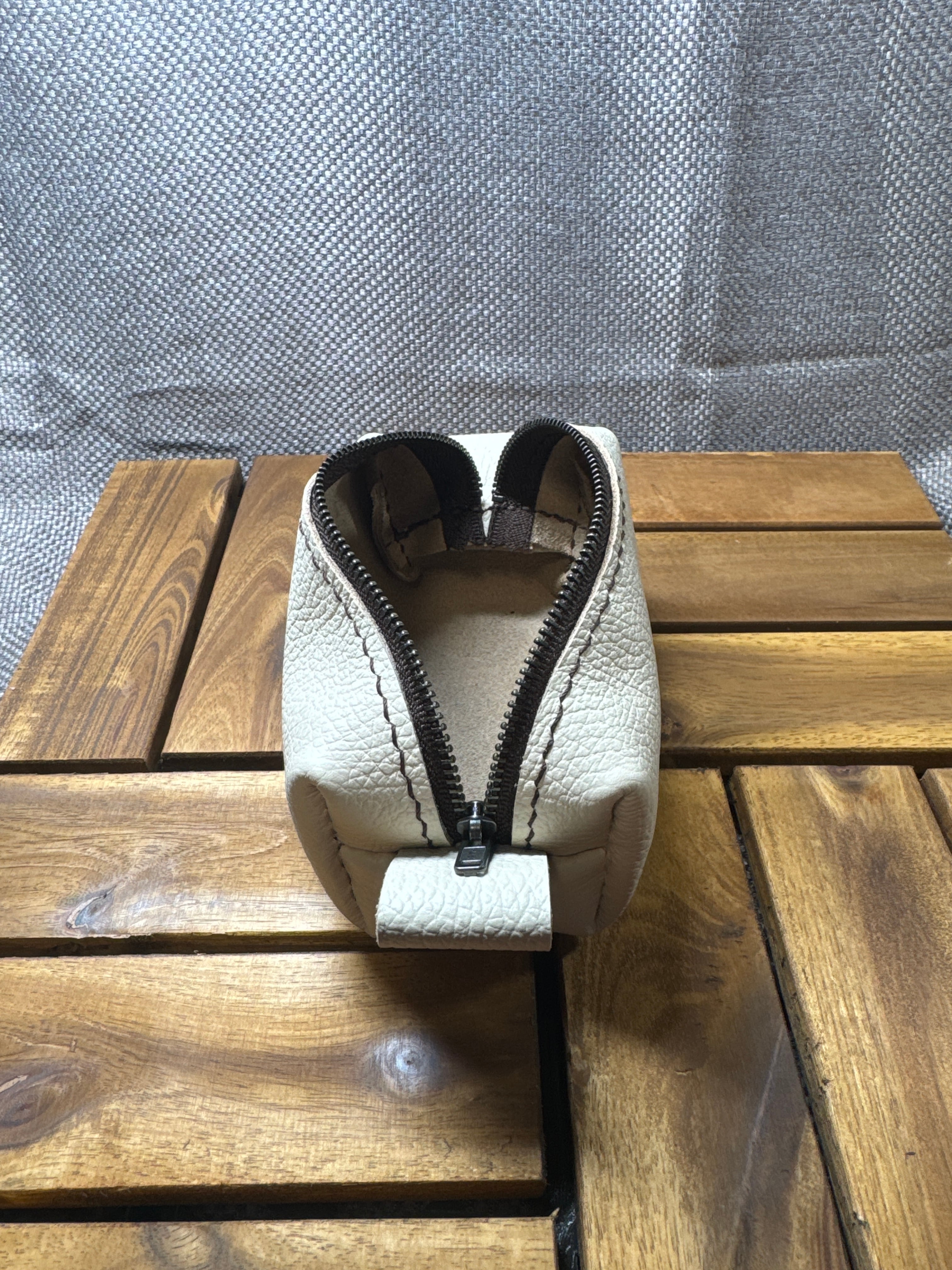 ウルルポーチは、上質な牛革を使用したアイボリーのコンパクトポーチです。クロム鞣し加工により、しっとりとした手触りとシボ感が魅力的。小さめのサイズながらも使い勝手も良く、メイク用品や小物を整理整頓するのに最適です。